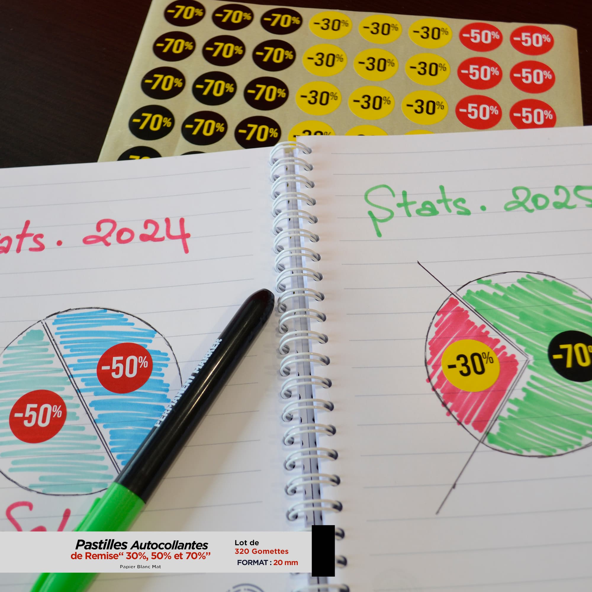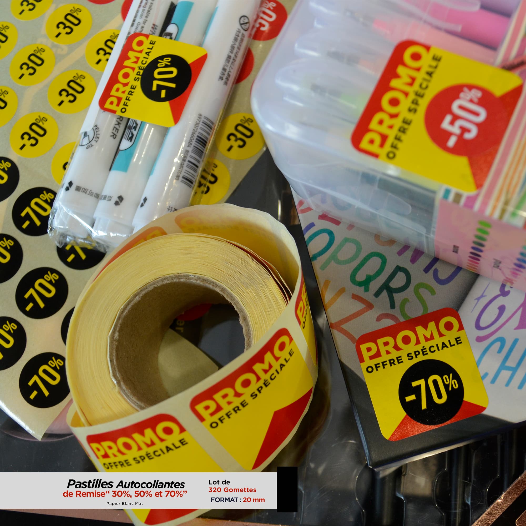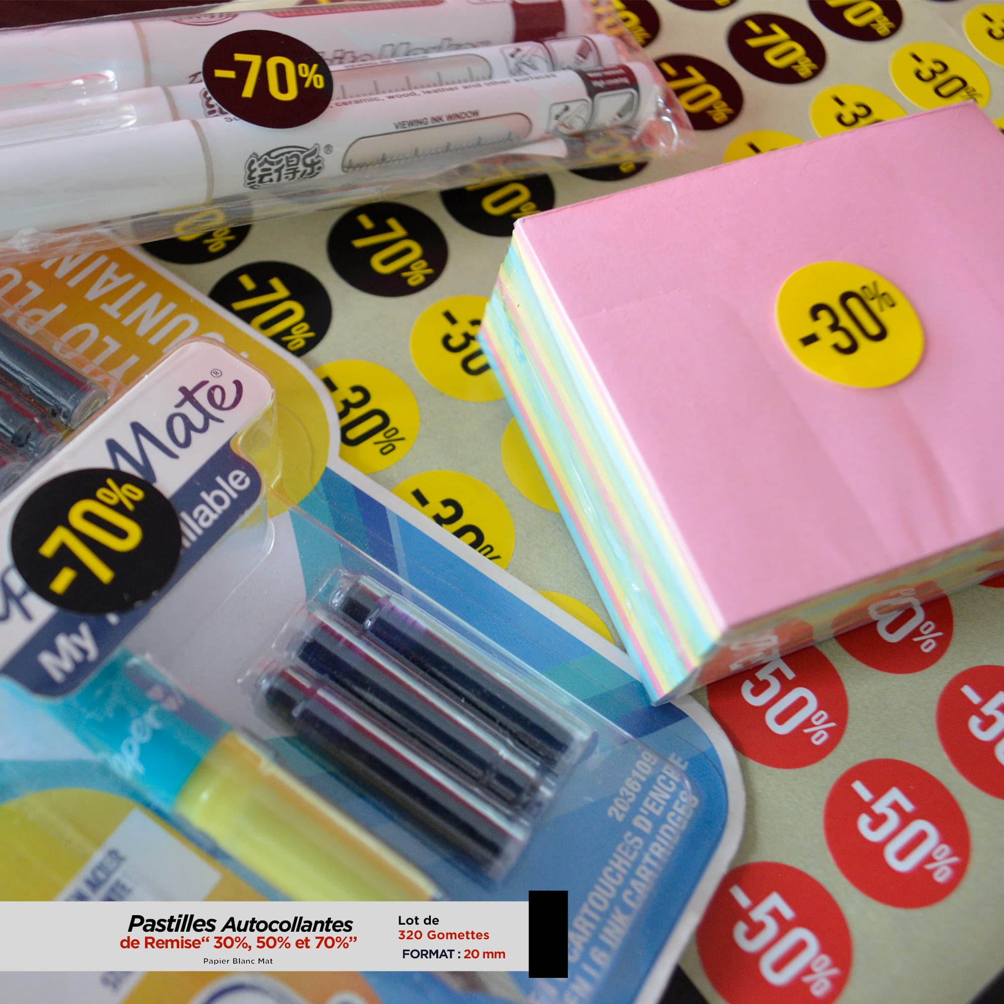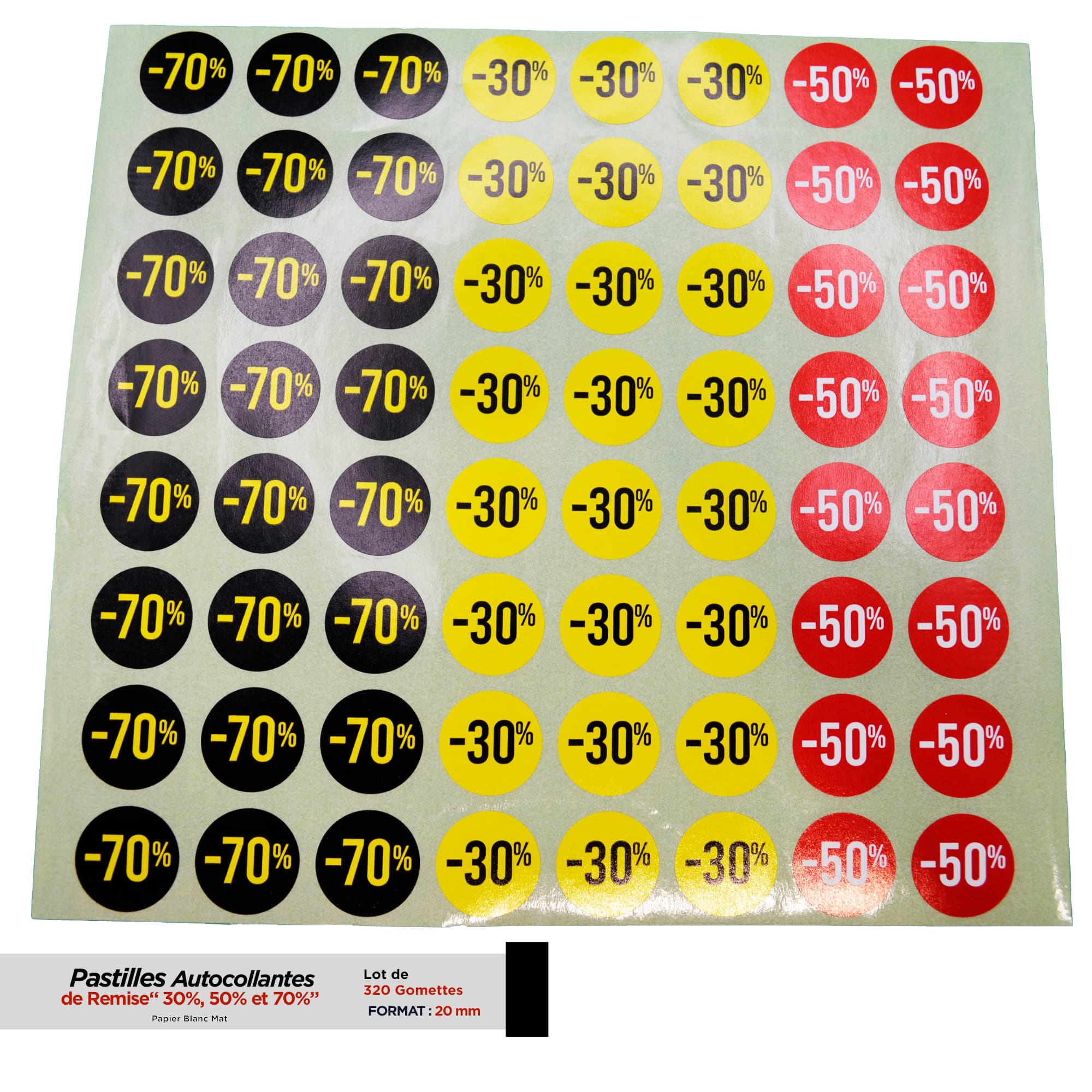 Chaque gommette affiche clairement le pourcentage de réduction (30%, 50% ou 70%) pour une visibilité immédiate en rayon ou sur vos produits.